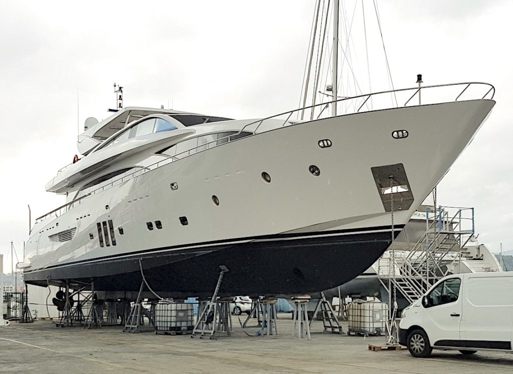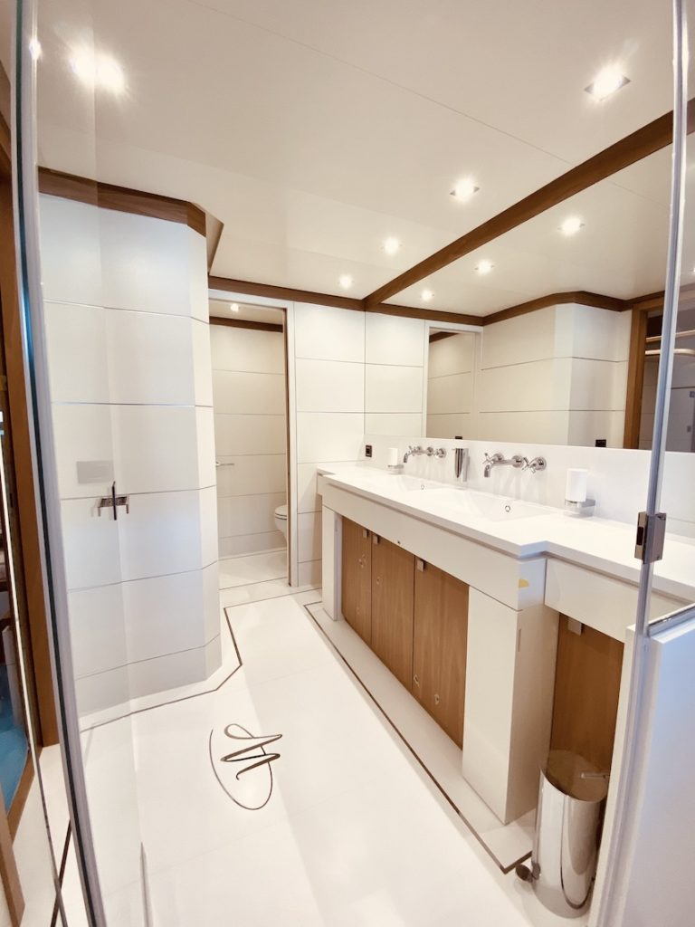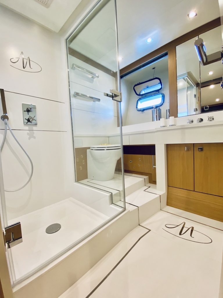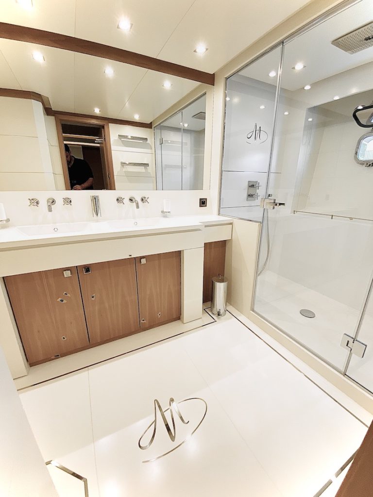 Aménagement des salles de bain du yacht Millésime avec marqueterie en corian. Baguettes en inox sur les murs, sol en planacryl, et logo en inox.